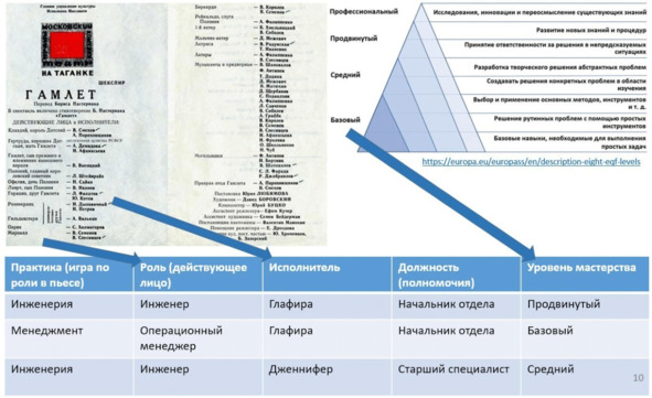 Чтобы стать действующими лицами в проектах, людям как исполнителям ролей нужно занять в них какие-то деятельностные/профессиональные роли (менеджера, архитектора, видеографа, повара). Театральная метафора – это когда мы играем проект как пьесу с ролями, и явно или неявно договариваемся кто играет какую роль, то есть кто что делает в этой пьесе. Мы отличаем исполнителей ролей, сами роли по исполнению каких-то практик/деятельностей в проекте, должности как выражение ответственности/полномочий по распоряжению ресурсами труда и капитала, квалификацию/уровень мастерства в исполнении ролей.