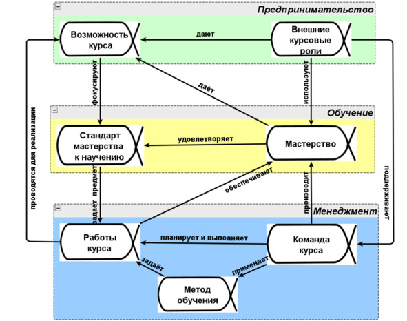 • студент/ученик (а на других стадиях курса это выпускник и далее мастер) – «сырьё» для образования, «носитель мастерства» на которого будет это мастерство впечатано курсом – абсолютно инженерное понимание, никакой «лирики» или психологизма! Именно с этим объектом-ролью будет работа с мотивацией в ходе всего курса: обучающийся человек должен как-то удерживаться в роли студента, а после окончания курса переходить в роль мастера (ибо выучиться, но потом не использовать результат обучения – мы же не этого хотим?). Курс – это сервис по обучению/изменению студента, доводки студента до выпускника-мастера с инсталлированным в него мастерством.
