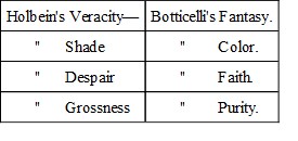 Yet that intense veracity of Holbein is indeed the strength and glory of all the northern schools. They exist only in being true. Their work among men is the definition of what is, and the abiding by it. They cannot dream of what is not. They make fools of themselves if they try. Think how feeble even Shakspere is when he tries his hand at a Goddess;—women, beautiful and womanly, as many as you choose; but who cares what his Minerva or Juno says, in the masque of the Tempest? And for the painters—when Sir Joshua tries for a Madonna, or Vandyke for a Diana—they can't even paint! they become total simpletons. Look at Rubens' mythologies in the Louvre, or at modern French heroics, or German pietisms! Why, all—Cornelius, Hesse, Overbeck, and David—put together, are not worth one De Hooghe of an old woman with a broom sweeping a back-kitchen. The one thing we northerns can do is to find out what is fact, and insist on it: mean fact it may be, or noble—but fact always, or we die.