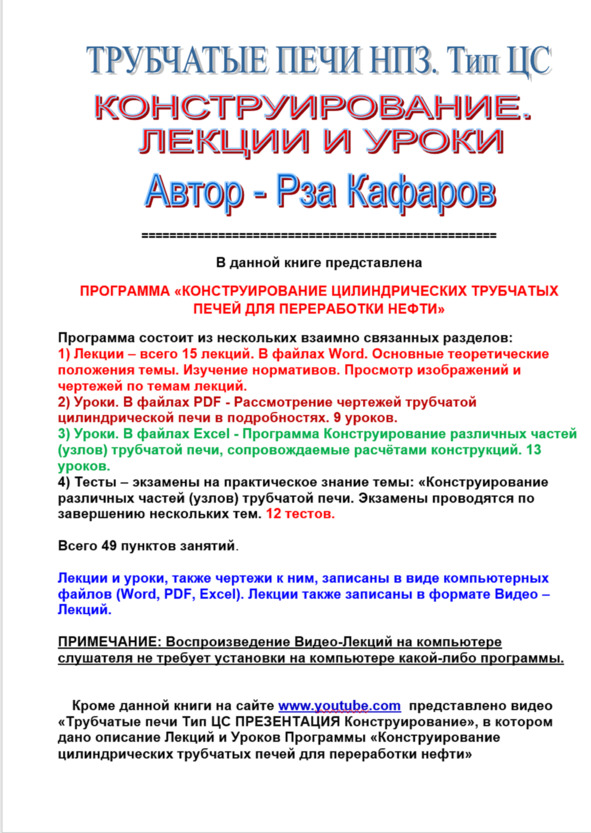 Кроме данной книги на сайте Трубчатые печи Тип ЦС ПРЕЗЕНТАЦИЯ Конструирование», в котором дано описание www.youtube.com представлено видео « Лекций и Уроков Программы «Конструирование цилиндрических трубчатых печей для переработки нефти»