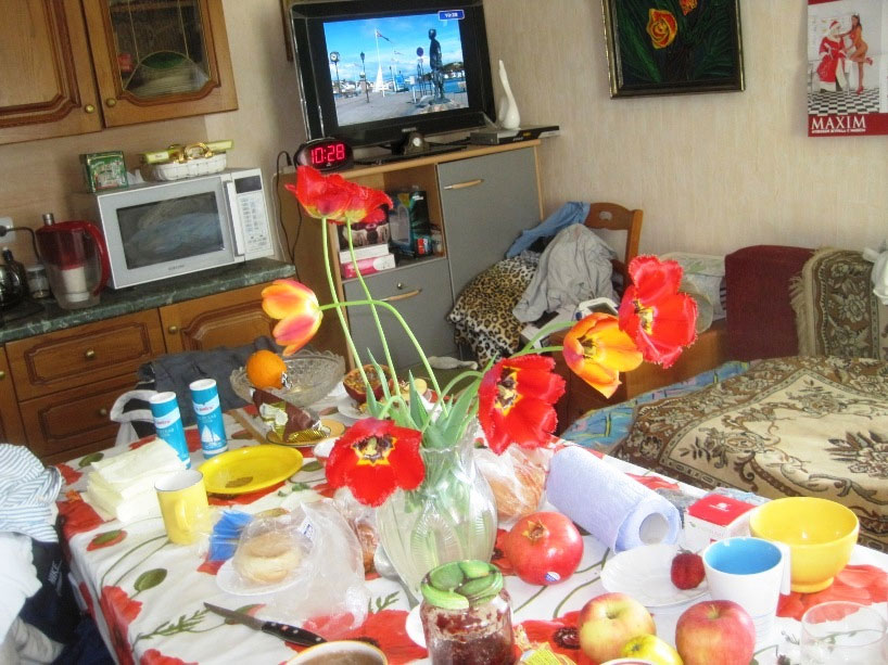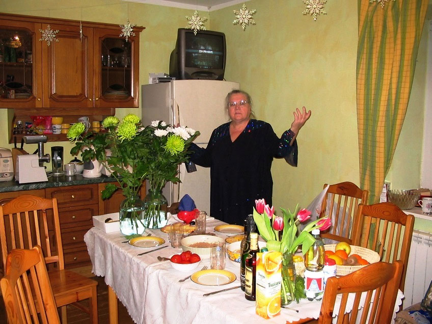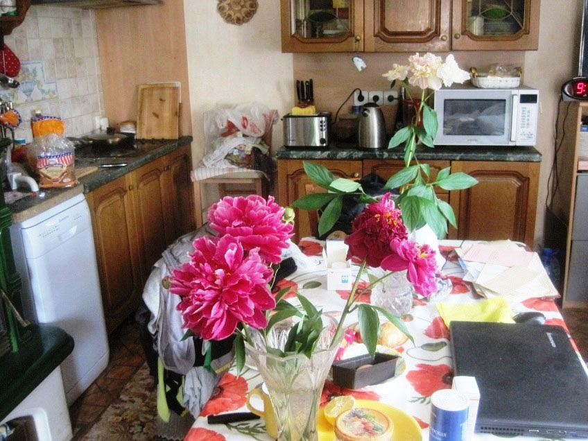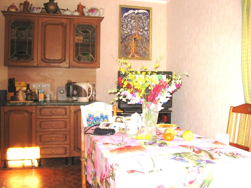 В завершение нашей меблировки – всю середину комнаты занимает раздвинутый стол и вокруг него стулья, всегда готовые принять гостей. Живя вдвоём, всё равно на обед стол сервирую так, что свободного места на нём не остаётся. Впрочем, так же, как и во всей комнате.