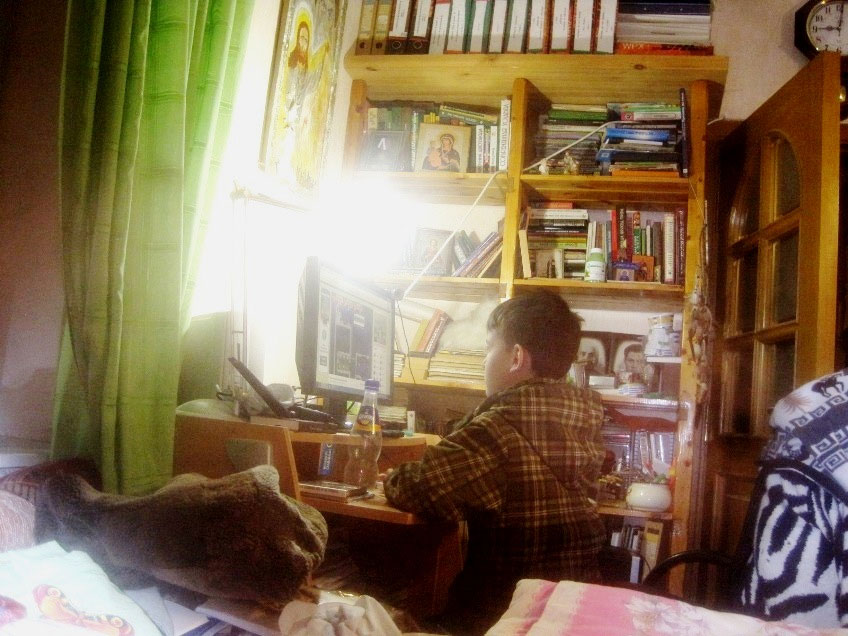 Входим… Справа в углу у кусочка стены – этажерка с нашими рабочими книгами и тетрадями. По правой стене, рядом с этажеркой – рабочий столик с компьютером.