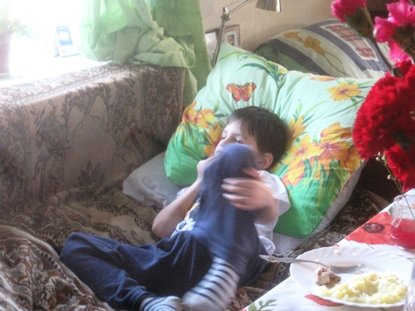Пока мы беседуем за столом, наш правнук Илья спит на диване, загороженном стулом.