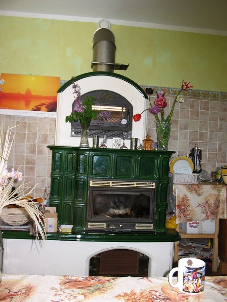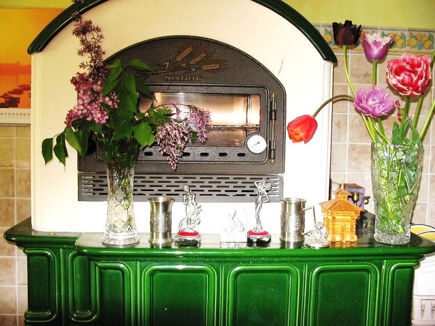 И наконец, от машинки для мытья посуды до двери, как барин в дорогом поместье – разместился большой камин. Дорогой, красивый, одетый – в изумрудного цвета итальянского производства израсцы, с духовкой в верхней части, трубой, выведенной на крышу домика и настоящей печкой внизу. Так-то мы зимой обогреваемся электроплитами. Но бывает такое – отключают свет и порой надолго. Домик остывает быстро. И тогда мы зажигаем дрова, которые всегда хранятся – заранее сложенные в печи. И глядя на игру языков пламени, исполняющих дикие мистические пляски в темноте ночной комнаты, мы уносимся мыслями в другие миры и не можем оторвать взгляд от этого колдовского зрелища.