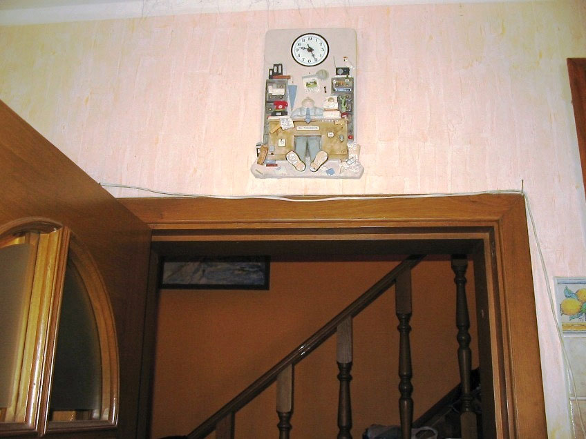 На снимке над нашей дверью в комнату висели эти часы, вмонтированные в картину, выполненную в скульптурной форме на керамике. На ней изображена карикатура заснувшего за рабочим столом начальника. Это был такой весёлый подарок папе в какой-то праздник – от дочки.
