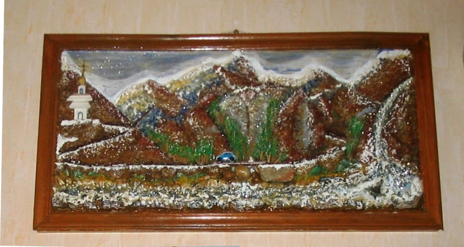 Это мой сын Олег. А слева на стене – мои любимые горы. На картине горы вылеплены из размоченных обрезков плиток ДСП. Водопад и река – из мелкой гальки и т. д.