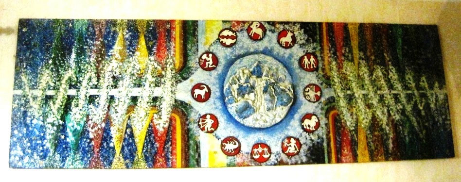 Снимок был сделан неудачно. Это панно висит на стене в изголовье моей кровати, причём под самым потолком. Видимо Виктор снимал его сбоку и снизу. Тем не менее – рассмотреть его можно, правда не всё. Фигурки знаков зодиака изготовляла отдельно и потом наклеивала. Шарик наш земной тоже собран из приклеенных деталей композиции, сделанной из камней и пенопласта.