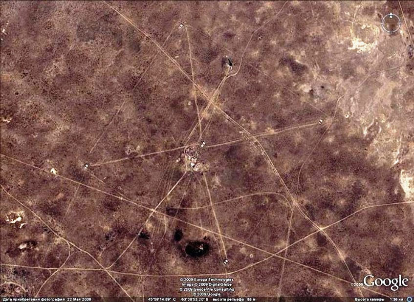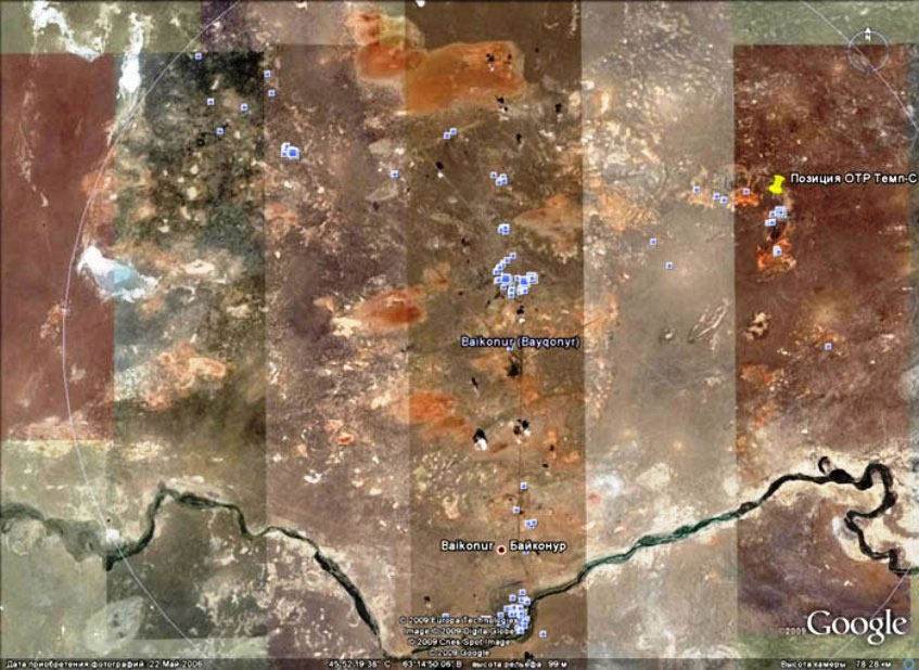 Предполагаемые позиции комплексов «Темп-С» в ходе эксперимента «Свинец» в 1971 г. на территории космодрома Байконур. Южнее позиций на расстоянии около 1.5 км измерительный пункт ИП-2 на площадке 44 (http://maps.google.com)