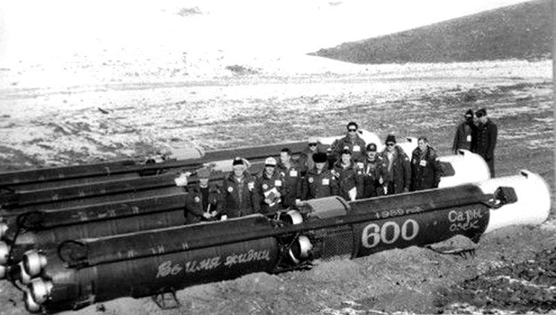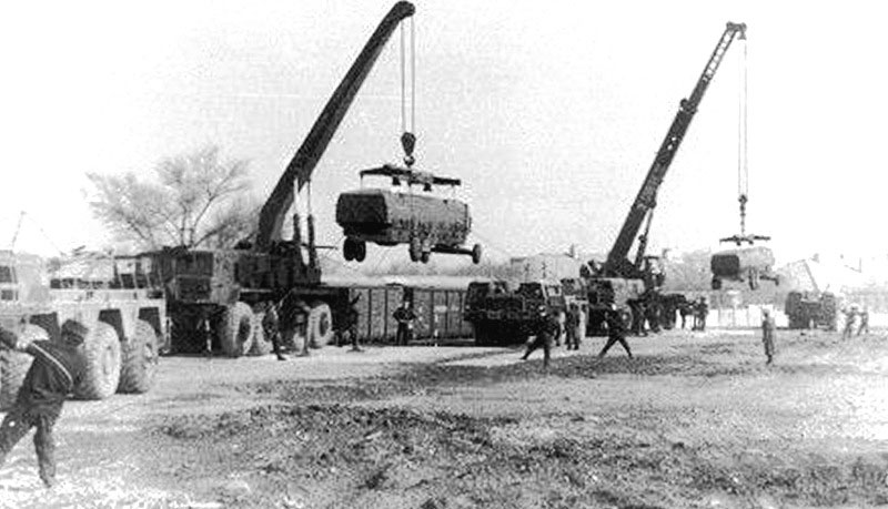 Разгрузка и подготовка к уничтожению ракет 9М76 в Сары-Озеке, 1989 г. (http://swalker.org, обработано).