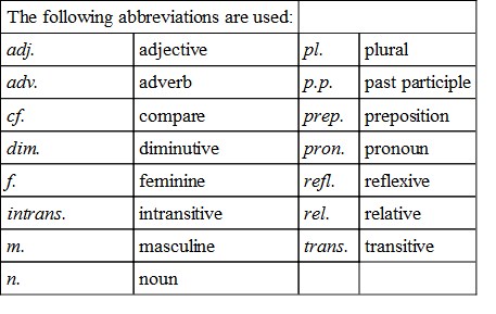 The vocabulary is intended to include the infinitives of all verbs found in the text, the masculine singular of adjectives, and the singular of nouns. Adverbs regularly formed from adjectives of corresponding meaning are omitted when those adjectives are present. Articles, personal pronouns, numerals up to twelve, and words identical in meaning and spelling with the English are also omitted.