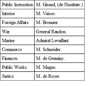 In France, a ministerial revolution has taken place, resulting in widening the breach between President Napoleon and the National Assembly. Several general orders of General Changarnier to the army of Paris having been published in one of the journals, in which he commands the troops to pay no attention to any orders but those of the Lieutenant-General. Changarnier was called upon in the Assembly for explanation. He denied that these instructions were meant to be permanent, but only to be put in force when an emeute was apprehended. His conduct was approved by the Assembly, but Louis Napoleon, who had long regarded Changarnier with fear and jealousy, withdrew from him the command of the army at Paris, which he divided between two or three generals of lower rank. This gave rise to a most excited debate in the National Assembly, in which Lamartine made a speech in the President's defence. Baroche, Minister of the Interior, General Changarnier, M. Thiers, and General Cavaignac followed, the three latter speakers taking strong ground against the ministry. After several days of stormy discussion, the resolution of M. de St. Beuve, that the Assembly "declares that it has no confidence in the ministry," was carried by a majority of 139. The ministers tendered their resignation to the President the same evening. A ministerial interregnum followed, which was terminated on the twenty-fourth of January by a message of the President, appointing a "transition ministry," composed of employées from the different departments, not one of them having a seat in the Assembly. The following is the list, as given in the Moniteur: