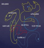 Ось мира прямой линией идёт от западного края Европы (там выбита морда медведя, то есть это созвездие Медведицы), шляпы человека, держащего в одной руке факел, в другой – диск и купол над миром, к реке Ока и Байкалу. По пути линия пересекает две морды льва, голову викинга и упирается в когтистую лапу льва и руку ребёнка в ползунках. Осталось прочесть по рельефу, что за смысл в этом рисунке на планете Земля. По шляпе человека идёт текст: «Дом сармати. Ковчег Ара. Шар Шива». Выходит, между сарматами и ариями можно поставить знак равенства. По оси идёт надпись «Дом Рима», по низу – «Хата Хама. Рать Хама (сына Ноя)», возле ребёнка – «Ковчег Тартарии». На руну в районе Оки похожа повёрнутая боком буква П, что означает «кладезь памяти» (Википедия):