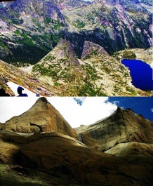 Есть ещё две замечательные мегалитические постройки – каменные параболы на Кайласе и на Ергаках России (фото с сайтов forum.littleone.ru и mt-kailash.ru):