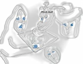 На других скалах Верхней Балкарии тоже есть надписи, и вот, о чём они поведали: «Астероид Зевс от дочери медведицы ожил. Падал до Оки и Оби. Арии тут обитали. Рауфа (Татарстан), медвежьи очи рисовал. Медведь – ариев Боже. Яуза омывает скотный двор. Очи жабы. Оки рок. На Оке – руна. Это ось мира». Про медведя у Раифы я уже много раз упоминала, а вот об оси мира на реке Ока не знала. Смотрите, как это выглядит: