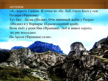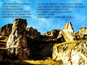 Думаю, уже любой увидит изображения и буквы на рельефе склона горы. А вот, что я прочитала: «Храм-дом. Ложе мары. Рыло ужасной совы. Ула – торс зеркала. Рожа уходящего солнца. Ценная, красивая звезда Венера висит – солнца бессмертная дочь. Вытравлена. Прекрасный лик на плите. Сообщение миру – коды воина Вары. Сивые очи нави. Свили в Аркаиме солнце Ра. Вращался предсказанный не по оси, шел в дом летающий диск. Исса зашил агни (бога огня) головёшкой». В районе Аркаима, недавно открытом городе – обсерватории, действительно, «свито» солнце и морда льва: