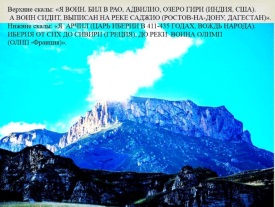 Верхний уровень: «Я воин. Бил в Рао, Адвилио, озеро Гири (Индия, США). А воин сидит, выписан на реке Саджио (Ростов-на-Дону, Дагестан)». Нижние скалы: «Я Арчил (царь Иберии в 411-435 годах, вождь народа, Википедия). Иберия от сих до сивири (севера), до реки воина Олимп (Олип, есть во Франции)». На рельефе Олип Франции нашёлся сидящий воин со скипетром в руках: