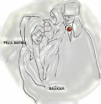 Река Витим находится севернее Байкала, там из морды рыбы или дракона, как бы выливается вода в озеро. Нашлись здесь мальчик, держащий кувшин, и девочка, на коленях которой Байкал лежит. Позади мальчика стоит мужчина в высокой шапке. Смысл текста совпадает с текстом на скалах: