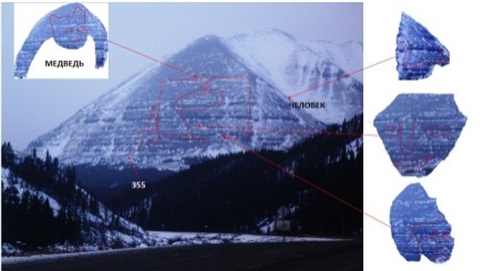 Выделяю гору крупнее и увеличиваю контрастность снимка, чтобы прочитать тексты и увидеть изображения на горе: