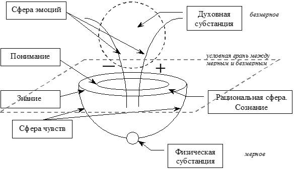 Наиболее важным элементом физической субстанции является нервная система, которая через органы чувств по пяти каналам обеспечивает информацией рациональную сферу. Сфера чувств является посредником между телом и сознанием. На схеме на рисунке №3 она обозначена линиями, идущими от физической субстанции к рациональной сфере. Следует добавить, что чувства есть отображение предметного мира. Доставляемые зрением, обонянием, слухом, осязанием, вкусовыми рецепторами чувства-информация обрабатываются уже рациональной сферой, расположенной на грани между мерным и безмерным. Вначале здесь формируются знания. На схеме это внешняя окружность. Как уже говорилось ранее, знание, мысли, являются систематизированными чувствами. Знание это систематизированная информация об окружающей действительности, явлениях и предметах. После того как к ним будет присовокуплено отношение, они переходят в разряд понимание. На рисунке №3 область понимания изображена внутренней окружностью рациональной сферы. Понимание, как мы уже знаем, является более глубинным явлением по сравнению со знаниями. Оно характеризуется структурированным отношением. Вспомним определение, понимание – это процесс выработки отношения. Получилось, что все события и предметы, с которыми у человека было непосредственное взаимодействие, откладываются в виде понимания, отношения. Последнее, в свою очередь, представляет собой структурированную систему эмоций. Данные системы эмоций наполняют эмоциональную сферу, имеющую в целом два полюса негативный и позитивный. На схеме они указаны восходящими дугами. Это сделано потому, чтобы показать безмерность, нематериальность эмоциональной сферы, её восхождение к самой глубокой сущности человека. На самом верху рисунка №3 окружностью с пунктирной линией изображена духовная субстанция, душа. Пунктирная линия применена потому, чтобы указать на отсутствие границ последней. Действительно, ведь говоря о духовной субстанции, мы должны понимать, что она не имеет границ и существует в мире безмерного, абсолютного. Эмоциональная сфера, восходя вверх, наполняет духовную субстанцию. Получилось, что все переживаемые в течение жизни человеком эмоции наполняют последнюю. Так в целом выглядит принципиальная схема устройства сущности человека.