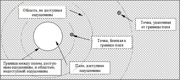 Теперь надо сказать, что быстрее всего наука смогла обнаружить те предметы и явления, которые расположены в непосредственной близости к границам поля ощущений. На рисунке №1 это «точка, близкая к границе поля». Так, Левенгуку потребовались не столь сложные по конструкции микроскопы, чтобы проникнуть в неизведанное. Чем дальше от границ поля, тем сложнее технически уловить то, что недоступно для наших органов чувств, но существует в реальности. На рисунке №1 это «точка, удаленная от границы поля». Например, сегодня познание проникло вглубь атома, и для этого потребовались более сложные инструменты и технические приборы. Но если далее продолжить ход рассуждений, вполне обосновано можно заключить, что существуют точки, удаленные от границы поля в далекой бесконечности, и человечество пока не имеет о них ни малейшего представления. Просто еще не создан такой технический инструмент, который бы обнаружил данные явления и расширил бы человеческие познания.