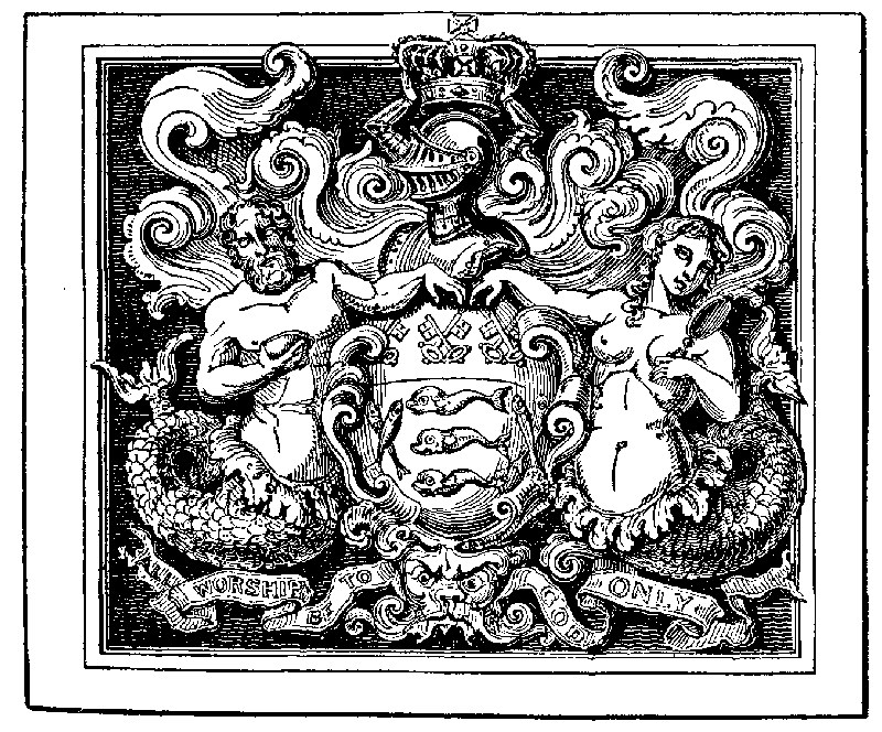 The Arms of the Company are in a shield supported by a merman and mermaid, the latter with a mirror in her hand. The Keys refer to St. Peter, the Patron Saint of the Company.