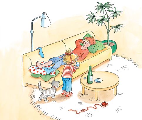Дома мама сразу ложится на диван. А Конни сначала тащит две подушки, чтобы уложить больную ногу повыше. Потом наливает в стакан воды, лишь чуточку пролив мимо, и осторожно несёт маме. Как будто теперь Конни – это мама, а мама – её малыш.