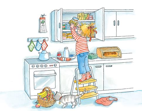 Конни бежит на кухню. Кто-то ведь должен разложить покупки по местам! Молоко, колбасу и картошку Конни убирает в холодильник. А макароны обычно лежат на верхней полке в шкафу. Это высоко, не дотянуться! Поэтому Конни забирается на небольшую лесенку, чтобы убрать их на место. Осталось положить фрукты в вазу, и готово! Конни гордится тем, как ловко она со всем управилась.