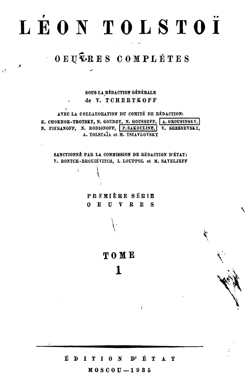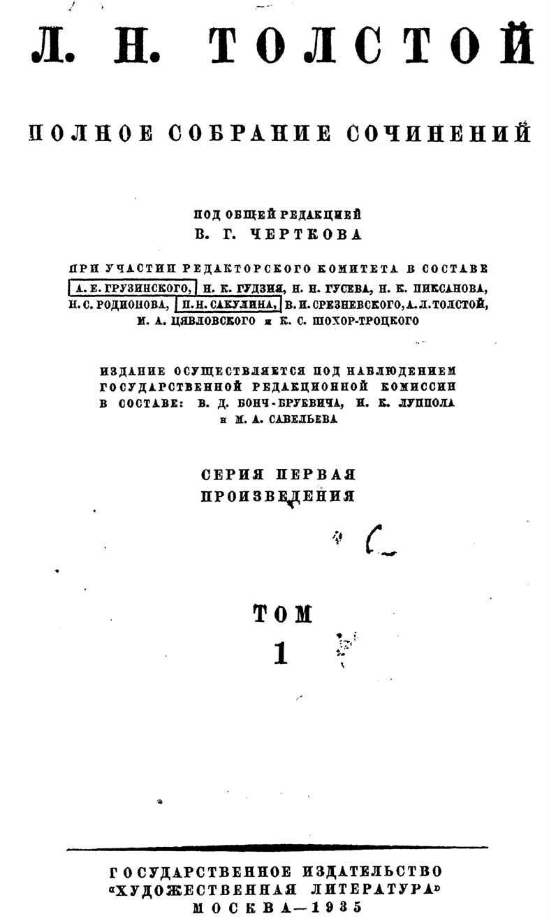 С 1864 по 1880 г. Л. Н. Толстой сам принимал ближайшее участие в издании своих сочинений, включая в них лишь вполне законченные художественные произведения и педагогические статьи. С 1885 г. – собрания сочинений Л. Н. Толстого выпускались его женой, С. А. Толстой, но все эти издания, включая и посмертное издание 1911 г., разумеется, были далеко не полными, так как в них не могли войти произведения Л. Н. Толстого, запрещенные в России, а также его дневники, огромное большинство писем, варианты и черновые его произведения. То же следует сказать и об остальных изданиях сочинений Л. Н. Толстого: т-ва Сытина, под ред. П. И. Бирюкова, т-ва «Просвещение», под ред. А. М. Хирьякова, выпускаемое Госиздатом в качестве приложения к журналу «Огонек» 12-цомное собрание художественных произведений Л. Н. Толстого и Ленинградское 15-томное издание Госиздата. Все эти издания, не являясь полными собраниями произведений Л. Н. Толстого, в отношении точности воспроизведения текста оставляли желать очень многого, так как сверки текста с первоначальными текстами и с рукописями автора не производилось.