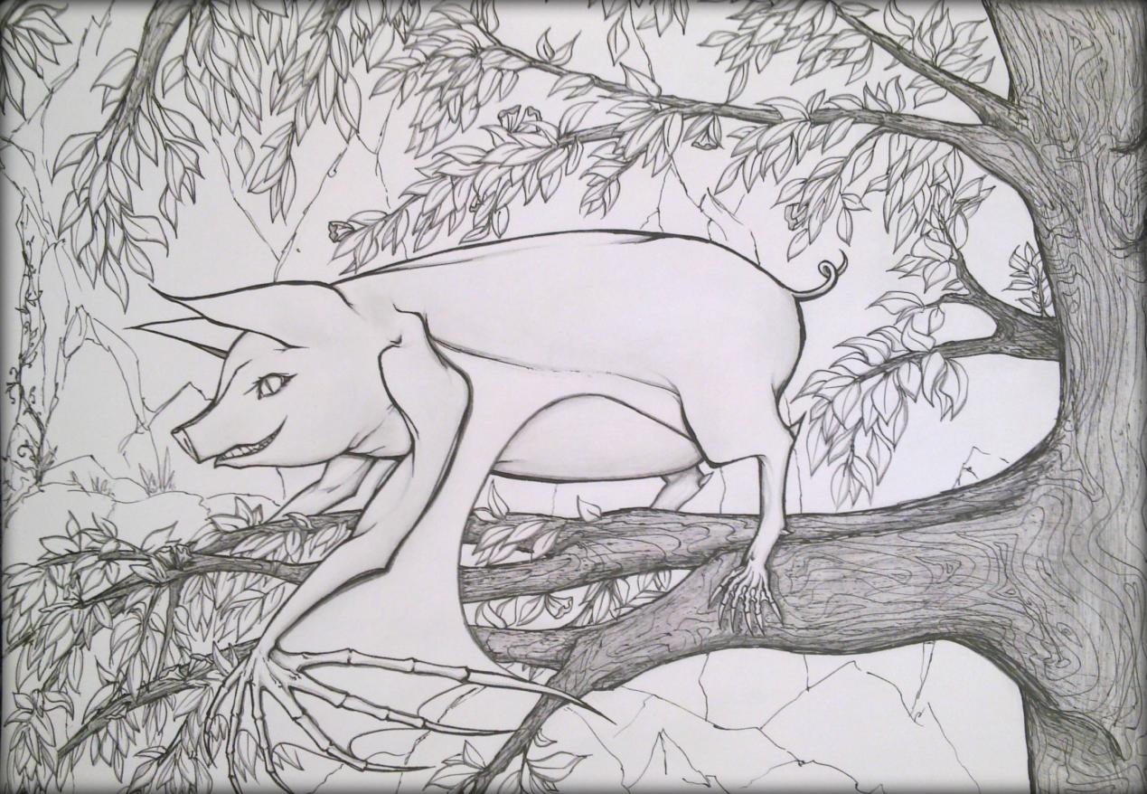 Свет заслонила тень над моей головой. Хм! Я поднял голову вверх и обомлел – с человекоподобной улыбкой и ровными зубками на меня смотрела свинья. Рукокрылыми лапами цеплялась за ветку дерева она взирала любопытными и голодными голубыми глазами, в которых ясно плясал игривый разум. Замерший от неконтролируемого ужаса я смотрел на демона. Тот, в свою очередь, открыл рот и прострекотал что-то непонятное.