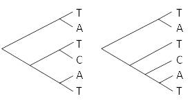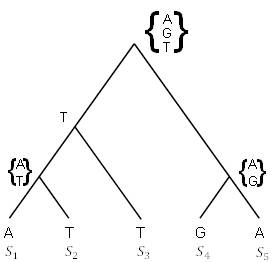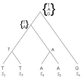 Если представить, что они были связаны деревом, показанным на рисунке 5.18, то можно пройти обратно вверх по дереву, чтобы определить, какое основание могло быть на этом на каждой внутренней вершине, предполагая наименьшее количество возможных мутаций.