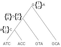 Переходя вверх по дереву, начиная с 2 последовательностей таксонов, ATC и ACC в крайнем левом углу, видим, что там не нужны мутации ни в первом, ни в третьем узлах, но понадобятся мутации во втором. Таким образом, количество мутаций теперь равно 1, а вершина предка помечена, как показано на рисунке. На вершине, где соединяется ребро из третьего таксона, обнаруживаем, что первый участок нуждается в мутации, второй нет, а третий снова нуждается. Это увеличивает количество мутаций на 2, чтобы суммарно дать 3. Наконец, в корне обнаруживаем, что нужна мутация только во втором месте, для окончательной оценки экономии 4.