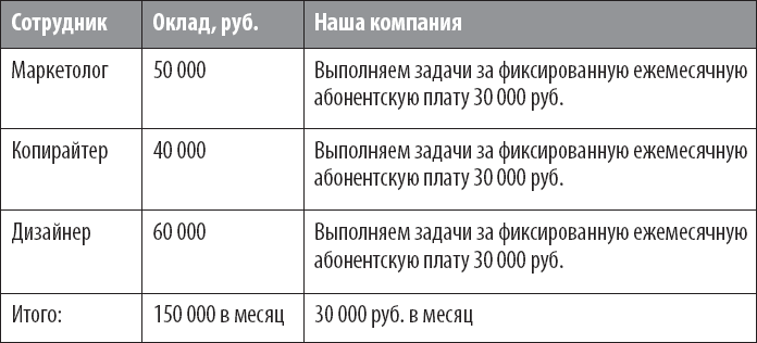 Однажды к нам поступил заказ. Требовалось разработать коммерческое предложение для рекламного агентства, которое предлагало услугу «Внешний отдел маркетинга». Это когда специалисты агентства берут на себя задачи штатного маркетолога. В тексте мы раскрыли все преимущества компании и услуги, а затем – в качестве вишенки на торте – использовали прием подачи преимуществ в сравнении с косвенным конкурентом. Как вы понимаете, это был маркетолог в штате. Мы составили таблицу, где были указаны оклады всех специалистов отдела маркетинга, чьи обязанности мы выполняли. Выглядело это так. Цифры примерные, взяты для демонстрации приема.