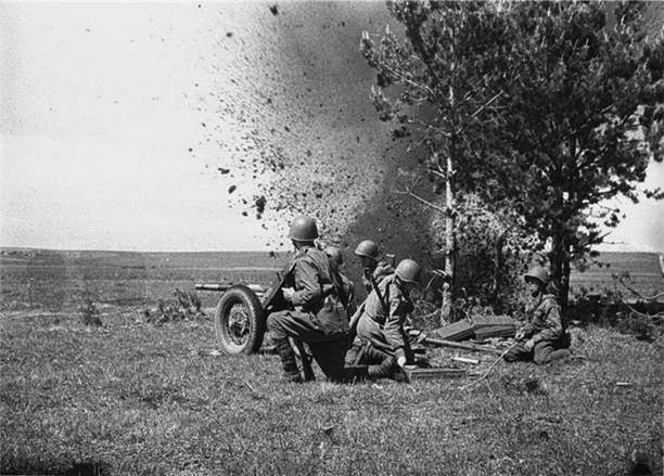 Сорокапятки прямой наводкой бьют по немецким танкам.В успехе боев за Краснодар важную роль играло успешное применение засадных действий бойцов 30 СД (снимок ЦГАКФД №056270 Т.Асса (бойцы в засаде). Август 1942 г.