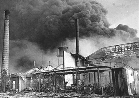 Разрушенный завод имени Седина на фоне горящей нефтебазы Краснодарского нефтеперегонного завода (ЦГАКФД оп.2, п. 16, сн.1)