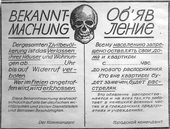 Город погрузился в атмосферу страха и безысходности. Вскоре улыбки с лиц «освободителей» и «романтиков» сошли. Город на три дня будет отдан на разграбление победителей. Оккупантам разрешалось брать у населения все, что понравится. Только после окончания повального грабежа ситуация войдет в какойто порядок, правда, со свойственными ему – «новому» немецкому порядку виселицами, облавами, расстрелами и душегубками. Поборы и грабежи будут производиться организованно, «законно»: по приказу коменданта, старосты или бургомистра, публично, с привлечением большой массы населения.
