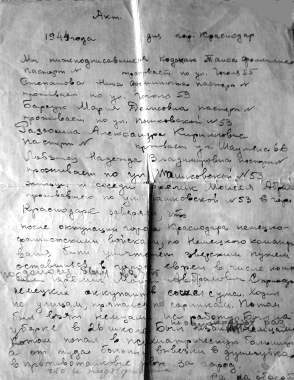 (Когда черновик книги был уже готов, эта фотография «заговорила». В Государственном архиве Краснодарского края мы обнаружили любопытный документ. Он рассказывал о трагической гибели краснодарца еврейской национальности Горелика Моисея Аврамовича. Нашлись и родственники этого человека. Он вернулся в город уже после того, как его семья была расстреляна в карьере, предназначенном для строительства железобетонного дота. Это событие настолько потрясло его, что он потерял рассудок. Некоторое время он прятался в садах, пока его не выдал ктото из местных жителей немецким властям. Некоторое время единственного оставшегося в живых еврея немцы использовали на уборке улиц, при этом каждый раз жестоко избивали, а затем отправили в 3ю городскую больницу для душевнобольных, которых вскоре вместе с ним отправили в душегубку. Таким образом, из 320 душевнобольных, отравленных газами в фашистской душегубке, нам, по крайней мере, стало известно о гибели одной из жертв.