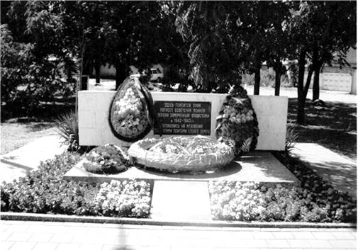 На черном постаменте, установленном в небольшом парке научноисследовательского института сельского хозяйства имени П. П. Лукьяненко, одиноко стоит памятник из черного мрамора, на нем высечены слова: «Памятник воздвигнут бойцам Красной армии, погибшим в дни Отечественной войны в боях за освобождение Краснодара, и нижепоименованным комсомольцам и рабочим Краснодарской госселекстанции, предательски убитым врагами 12.02.1943 года: Г. П. Лукьяненко, П. И. Калита, П. С. Черкашин, А. С. Мосол, А. Ф. Нестеренко, М. Н. Гиренко, П. Е. Тищенко, Г. В. Горобец, Г. К. Мороз, В. М. Хвостиков».