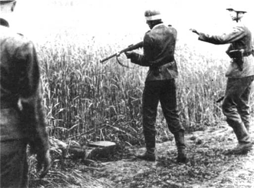 Отошли километров пять. Кругом степь. «Майор» остановил колонну около домика дорожного мастера и дал команду построиться в две шеренги. Её исполнили, ведь никто не подозревал, что это была провокация. После команды «Кругом!» по советским гражданам был открыт пулеметный огонь. Потом добивали уже лежавших раненых в упор из автоматов. Палачи сняли с рук жертв часы, вывернули карманы в поисках ценных вещей и продолжили путь в сторону Елизаветинской».