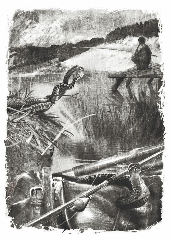 Стоя прямо под обрывом, я поставил на гальку дедушкину кожаную сумку, разложил удочки, разделся и стал собирать одежду в сверток. В этот момент над моей головой нависал глиняный козырек с обвисшим куском подсыхающего дерна. Когда я нагнулся к одежде, то почувствовал, как мне на спину посыпался песок. Я поднял голову и посмотрел вверх. Прямо надо мной, на краю обрыва, свесившись вниз и вбок головами, извивались две небольшие гадюки. Они переплелись своими блестящими телами и на весу вытягивались в сторону реки.