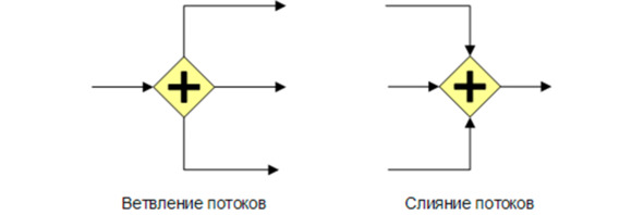 Шлюз «И» также используется для слияния (объединения) потоков, как показано на рис. 8 справа. Пока все токены, бегущие по стрелкам, не соберутся на шлюзе «И», этот шлюз не сработает и процесс дальше не пойдет.
