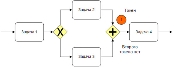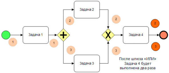 Рассмотрим следующую ситуацию, представленную на рис. 12. Она называется «Размножение токенов». После Задачи 1 шлюз «И» разделяет процесс на два параллельных потока (токены 2 и 3). Задачи 2 и 3 могу иметь разную длительность выполнения. Поэтому один из токенов первым прибежит на шлюз «ИЛИ». Этот шлюз сработает и будет запущена Задача 4. Потом прибежит второй токен и ситуация повторится. Даже если токены прибегут на шлюз «ИЛИ» одновременно, оба будут пропущены дальше и Задача 4 будет выполнена два раза.