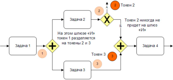 На рис. 11 показана другая ситуация. После выполнения Задачи 1 на первый шлюз «И» приходит токен 1. После этого шлюза возникают токены 2 и 3. Если после шлюза «ИЛИ» токен 2 пойдет по стрелке А, то второй шлюз «И» не сработает никогда, так как токен 3 будет ждать токен 2, который уже «убежал» по стрелке А. Если же токен 2 пойдет по стрелке Б после «ИЛИ», то шлюз «И» сработает и процесс перейдет на Задачу 4. Таким образом, в одном из случаев возникает логическая ошибка и процесс «зависает». Это весьма распространенная ошибка при моделировании. В таком простом контексте она достаточно очевидна. Но в сложных схемах такую ошибку легко не заметить. Так что нужно быть аккуратнее.