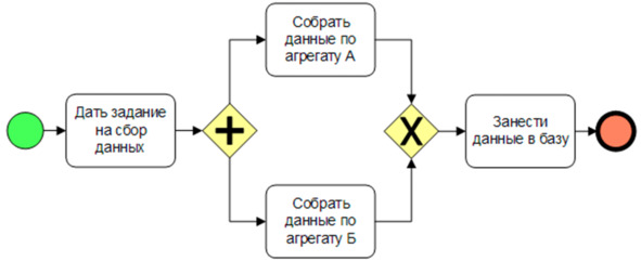 Если вас смущает такая конструкция, то можно поместить еще одну задачу между этими шлюзами. Она будет, например, анализировать данные и определять, как маршрутизировать процесс дальше. Хотя в BPMS такие действия вполне можно «повесить» на сами шлюзы.