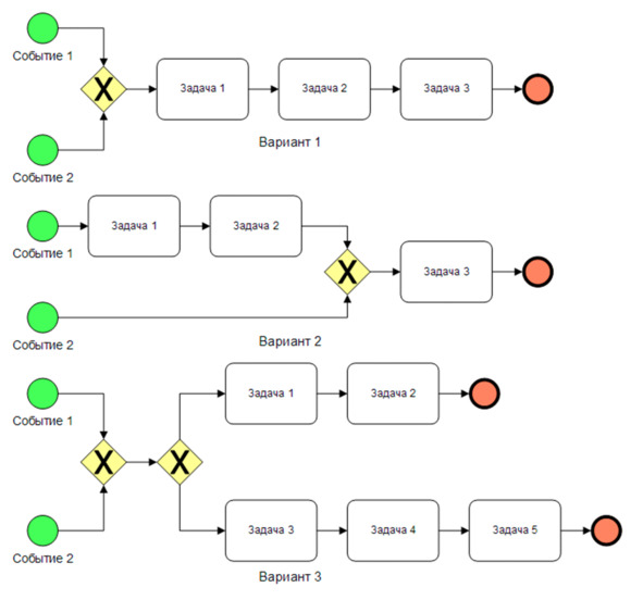 Вариант 3 – когда нужно на одной схеме показать два потока работ, которые вообще не связаны между собой и запускаются различными событиями. Для этого использованы два шлюза «Исключающее ИЛИ», стоящие друг за другом.