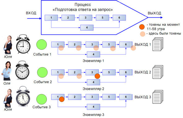 Рис. 1 иллюстрирует понятия токена и экземпляра. Представьте себе, что мы описали некоторый процесс под названием «Подготовка ответа на запрос», сформировали, утвердили и ввели в действие его регламент. Теперь нужно его выполнять.