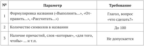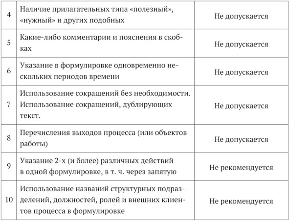 На схеме представлено шесть задач (операций). Термины «Задача» и «Операция» я буду использовать в книге в качестве синонимов. При именовании задач в нотации BPMN рекомендуется придерживаться правил, представленных в таблице 1. Почему это важно? Дело в том, что нечеткие, расплывчатые, некорректные названия препятствуют адекватной интерпретации схемы процесса ее читателями: руководителями, экспертами, исполнителями.