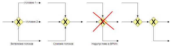 Далее на рис. 4 показан вариант, когда два потока сходятся и сразу расходятся на одном шлюзе «ИЛИ». В нотации BPMN это недопустимо. Необходимо использовать вариант с двумя шлюзами (показан на рис. 4 справа): сначала на объединение, а потом на ветвление потоков.