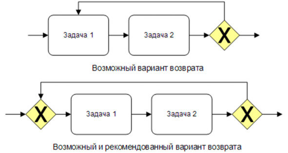 На рис. 5 показана схема с двумя вариантами моделирования возвратов. Вверху рис. 5 представлен вариант, допустимый нотацией BPMN. Многие так и делают. Но проблема в том, что при проектировании большой схемы можно допустить логическую ошибку. Например, там, где должно быть «И», есть риск не указать нужный шлюз, а просто присоединить стрелку к задаче. Но это уже будет не ситуация запуска по «И», а именно по «ИЛИ». Поэтому я рекомендую использовать вариант с «возвратным» шлюзом, то есть шлюзом «Исключающее ИЛИ» на слияние потоков. При таком стиле моделирования вероятность допустить логическую ошибку существенно ниже.