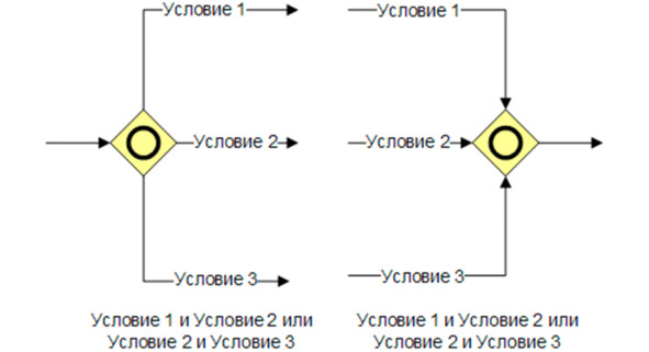 Справа на рис. 6 показаны стрелки с небольшими ромбиками. Это так называемые условные переходы. В нотации BPMN, как это ни странно, существуют две альтернативные возможности показать ветвление процесса.
