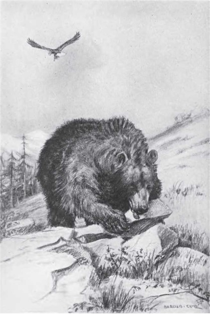 Я стремглав ринулся на вышку, схватил полевой бинокль и принялся за ним наблюдать. Он переворачивал камни и иногда принимался нюхать открывшуюся сырую землю, по-видимому, слизывая обитавших там муравьёв. Ему, убивавшему здоровенных быков одним ударом, это было на один зубок! Я подумал, что муравьи для него что для нас конфеты – не настоящая еда, да и совсем немного, но тем не менее очень приятно. Он находился примерно в полумиле от моей вышки – на таком расстоянии его не пристрелить. Через пару минут он начал спускаться по хребту и скрылся в густом ельнике – конечно, для дневного сна.